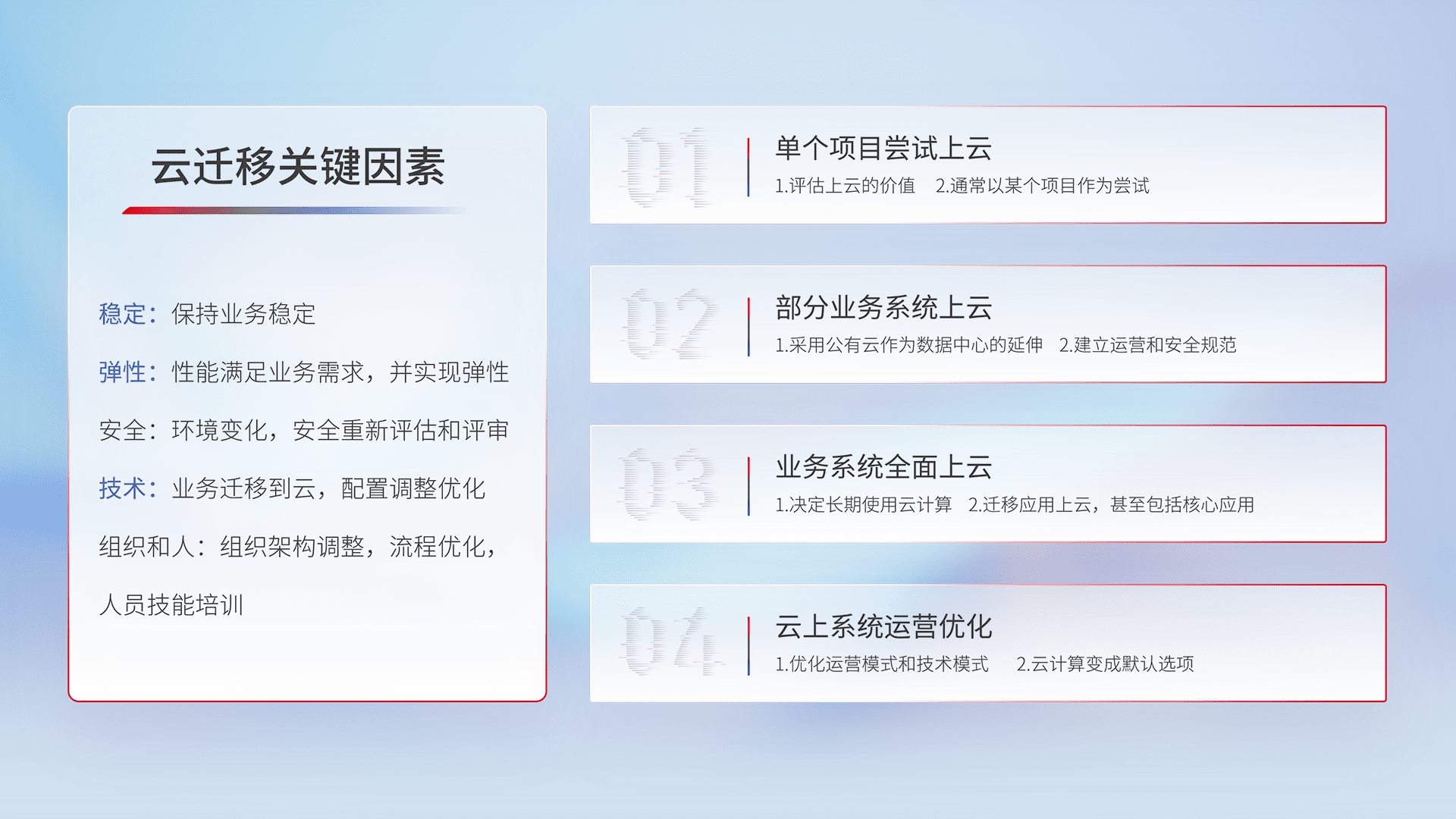结合实际业务,,从规划设计、、、云平台选型、、、、云原生改造、、、数据迁移、、、集成交付,,,,迁移全过程为客户识别最佳上云路径,,,做好风险识别管理,,,,设计网络架构、、、身份权限、、、安全审计合规、、、、操作审计、、、、日志审计、、、监控告警策略、、、多站点容灾设计等,,,对云上基础设施进行整体规划,,提升IT治理水平,,,以满足弹性、、、高可用、、、、高性能的需求。。