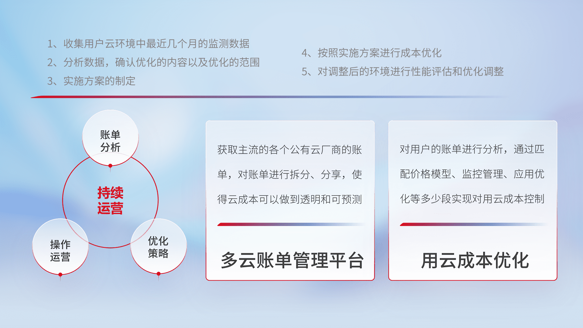 通过多云纳管,,,,以统一的资源数据模型把客户的云资源进行抽象和封装,,进而实现对多云资源的统一操作,,,,保障云资源管理的可靠性、、稳定性与可用性。。量身定制化运维内容,,配置、、开发运维、、补丁管理、、、、备份、、、、监控、、、、认证和访问管理、、审计和日常巡检等,,保障在用云过程中的可靠度,,稳定度以及高可用率。。。。